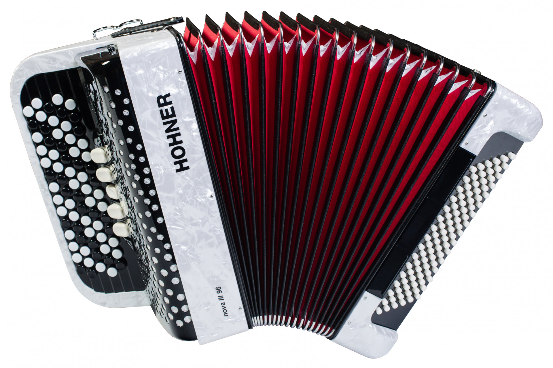 Аккордеоны HOHNER серии Nova обладают всеми характеристиками профессиональных кнопочных аккордеонов, хотя созданы для начинающих музыкантов. Эти инструменты очень хорошо звучат и удобны для игры. Инженеры Hohner разработали новую кнопочную клавиатуру, отвечающую международным стандартам эргономики. Для музыканта это означает более быстрый отклик инструмента, и, в то же время, сбалансированные, комфортные ощущения. Точно рассчитанные размеры декоративныйх отверстий на решетке позволяют получить великолепный баланс высоких и низких частот. Кнопочные аккордеоны NOVA уже много лет выпускаются на фабрике в Китае, которая производит инструменты на оригинальных станках эксклюзивно для HOHNER. Строгое соответствие высоким стандартам качества гарантирует квалифицированный персонал, обученный коллегами из Германии, а весь процесс производства контролируется из штаб-квартиры HOHNER в Троссингене. HOHNER Nova III 96 white это инструмент размера 7/8, трехголосный, с раскладкой клавиатуры в B. В комплекте ремни и утепленны