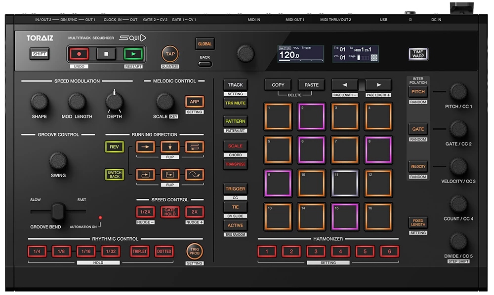 DJ Toraiz Squid – профессиональный секвенсор от компании Pioneer, который предназначен для работы в студии или на живых мероприятиях и за счет широких функциональных и коммутационных возможностей позволяет контролировать до 16 инструментов.