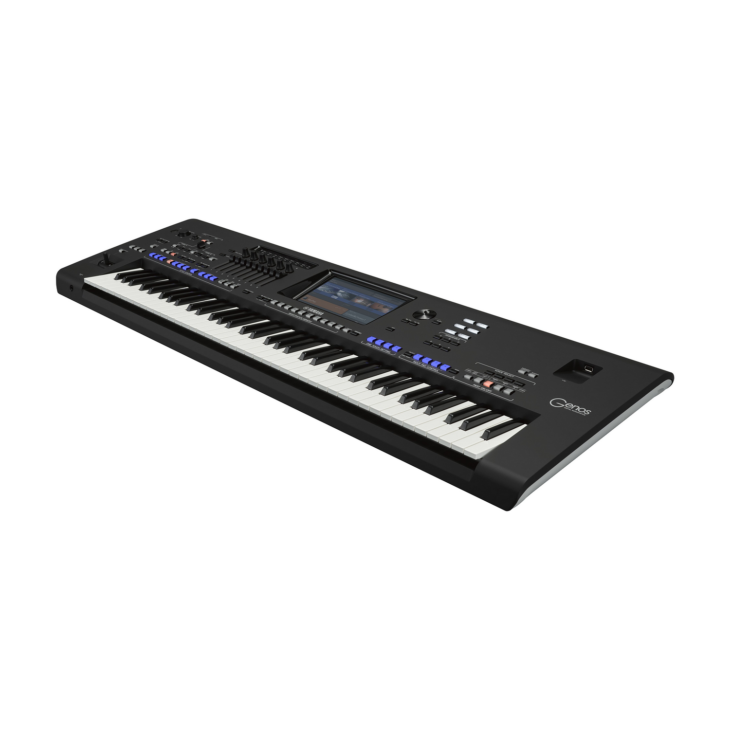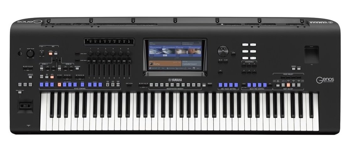 Yamaha Genos — профессиональная аранжировочная станция на 76 х клавиш с 1625 тембрами, 58 сетами ударных и эффектов, 256-голосной полифонией, 16-трековым секвенсором, USB-портом и 9-дюймовым сенсорным дисплеем.