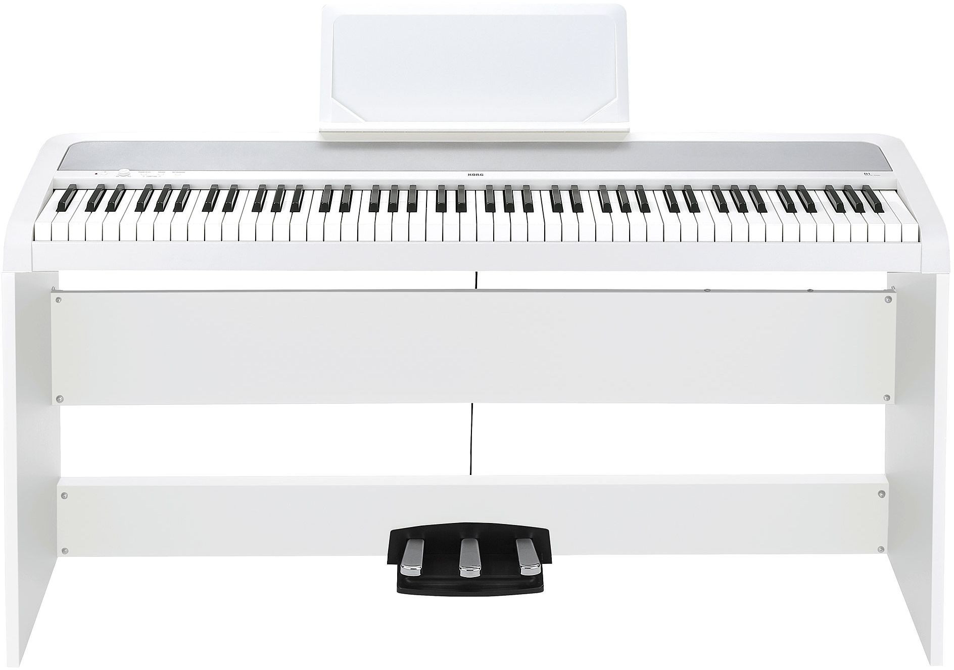 Korg B1SP-WH – цифровое пианино с взвешенной молоточковой клавиатурой на 88 клавиш, 8 тембрами и встроенными динамиками, в комплекте со стойкой и блоком из 3 педалей. Цвет: белый.