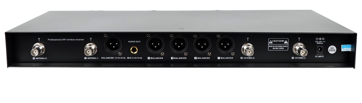 разъемы приемника: 4 выхода XLR, 1 общий выход Jack 1/4", 4 антенных коннектора BNC;