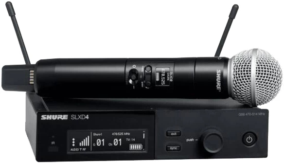 Shure SLXD24E/SM58 H56 — беспроводная система с ручным передатчиком SLXD2/SM58, одноканальным цифровым приемником SLXD4 и рабочими частотами 518 – 562 МГц.