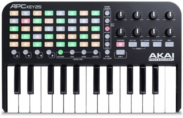 Akai Pro APC Key 25 является первым котроллером, который имеет высококачественную клавиатуру и разработан специально для Ableton Live. Контроллер объединил в себе панель для запуска клипов и клавиатурный интерфейс - APC Key 25 создан для работы в режиме реального времени в Ableton Live с традиционным набором инструментов. APC Key 25 имеет 25 мини клавиш, матрицу размером 5х8 с трехцветной подсветкой для запуска клипов, 8 ручек управления, USB питание, а так же подключение plug-and-play.