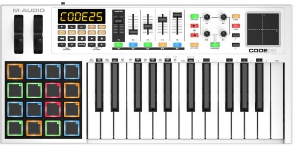 M-Audio Code 25 - профессиональная Midi-клавиатура, чья основная задача - покрывать все необходимые технические потребности для композиторов и музыкантов. Она обладает 25 полувзвешенными клавишами с послекасанием, 16 пэдами с регулируемой подсветкой, контроллерами модуляции и изменения высоты тона, XY-пэд;ом, 4 поворотными регуляторами, 5 фейдерами, входом для педали экспрессии, а также пакетом программного обеспечения в комплекте.