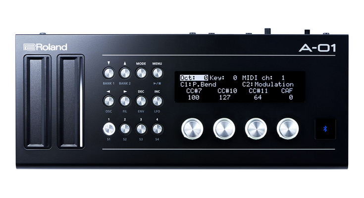Roland A-01 — компактный MIDI-контроллер с 8-битным звуковым движком, двойными назначаемыми ленточными элементами управления, 16-ступенчатым секвенсором, передачей MIDI по Bluetooth и встроенным динамиком на 0,5 Вт.