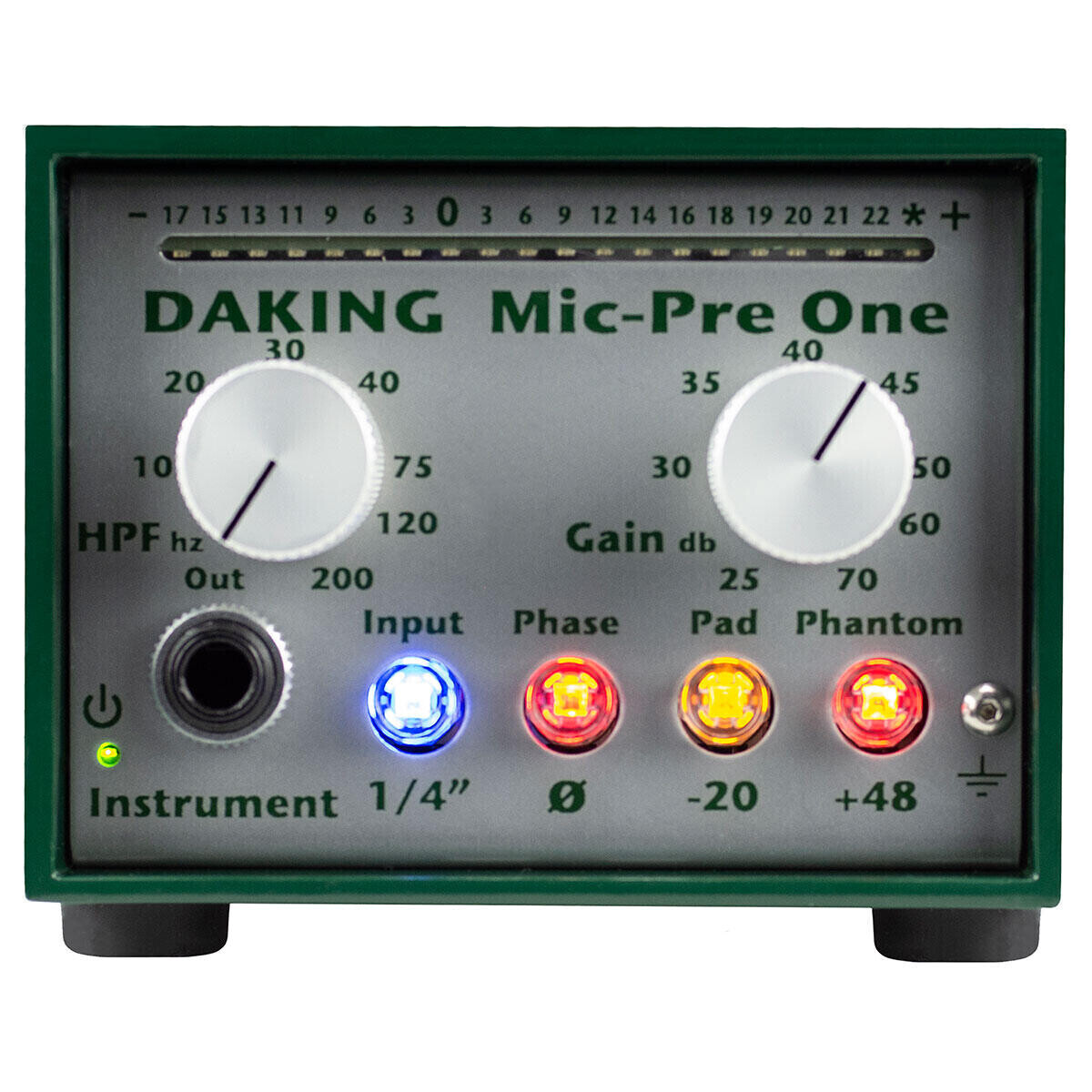 Daking Mic Pre One - одноканальный микрофонный предусилитель. Схема Daking Mic Pre основана на классическом дизайне консоли 80-х годов с некоторыми улучшениями: переменные фильтры высоких частот на каждом канале, входные трансформаторы Jensen, усиление класса A, чрезвычайно высокий запас по мощности (+24) и односторонний источник питания 48 В.