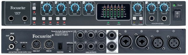 Focusrite Saffire PRO 26 – современный FireWire аудио-интерфейс c 18 входами и 8 выходами оборудованный преобразователем 24-бит/96 кГц, который способен работать с переходником через порт Thunderbolt.