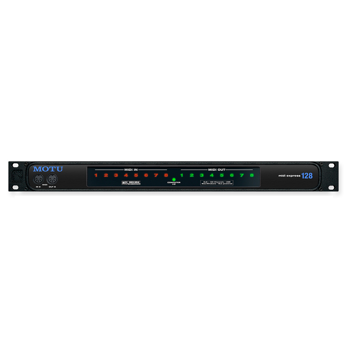 Аудиоинтерфейс MOTU MIDI Express 128. 8-входов, 9 выходов, 128 MIDI-каналов, совместим с Macintosh и Windows. MIDI Express 128 включает в себя преимущества USB, включая высокоскоростную пропускную способность MIDI, улучшенную аппаратную задержку (sub-millisecond), поддержку “plug-and-play”, индикаторы активности на передней панели. Предусмотрена возможность подключения синтезатора или звукового модуля с помощью дополнительного MOTU USB MIDI-интерфейса через любой доступный USB-порт.