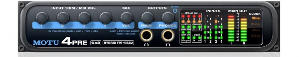 Имеет четыре микрофонных входа, снабженных фантомным питанием и предусилителями. При помощи поставляемого в комплекте программного обеспечения CueMix, вы можете работать с интерфейсом на подключенном компьютере. Благодаря технологии MOTU Hybrid interface, интерфейс без проблем подключается к любым компьютерам через порты USB 2.0 или FireWire.