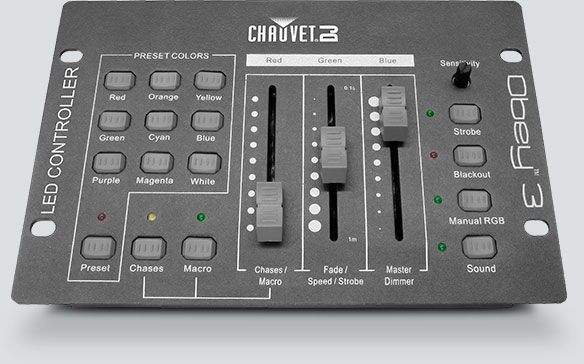 Chauvet Obey 3 – портативный DMX-контроллер для светодиодных световых приборов с тремя каналами (только красный, зеленый и синий). Функции воспроизведения включают автоматический, привязанный к звуку режимы и режим ручного управления каналами RGB.