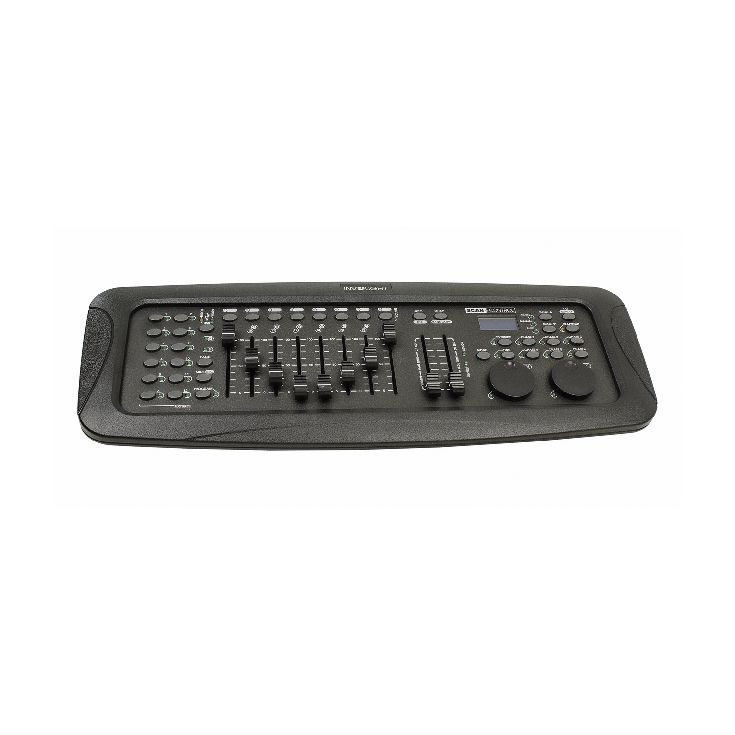 Involight SCANControl — рэковый DMX-контроллер для 12 приборов, с 16 каналами управления, 8 фейдерами, 6 программируемыми чейзами со 160 сценами в каждом.