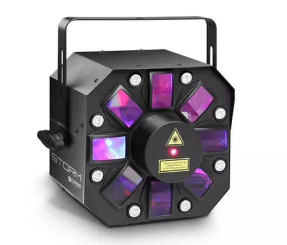 STORM от компании Cameo Light сочетает эффект «Дерби», лазер и стробоскоп в одном устройстве. Он может управляться через 10 каналов DMX, работать в режиме Master/Slave, автономном режиме или активироваться музыкой. Острые лучи лазера предусматривают 2 цвета, красный и зеленый, стробоскоп способен выдавать до 30 вспышек в секунду, а эффект дерби сочетает 5 цветов (RGBWA) для того, чтобы прибор полностью соответствовал настроению Вашей вечеринки.