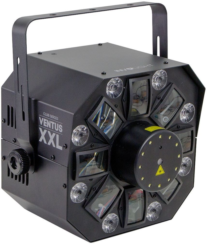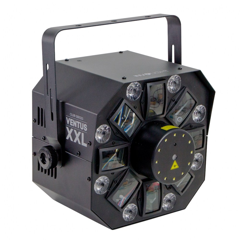 Он совмещает в себе функции светодиодного лучевого цветочного эффекта и заливки, лазерного проектора и стробоскопа. Здесь установлено 6 RGBWA + UV светодиодов мощностью 3 Вт, 8 RGB + UV светодиодов мощностью 4 Вт, 12 светодиодов для стробоскопа мощностью 1 Вт и лазер с красным (100 мВт) и зеленым (50 мВт) лучами. Прибор имеет несколько режимов управления - авто, аудио, DMX (4/13 каналов) и Master-Slave.
