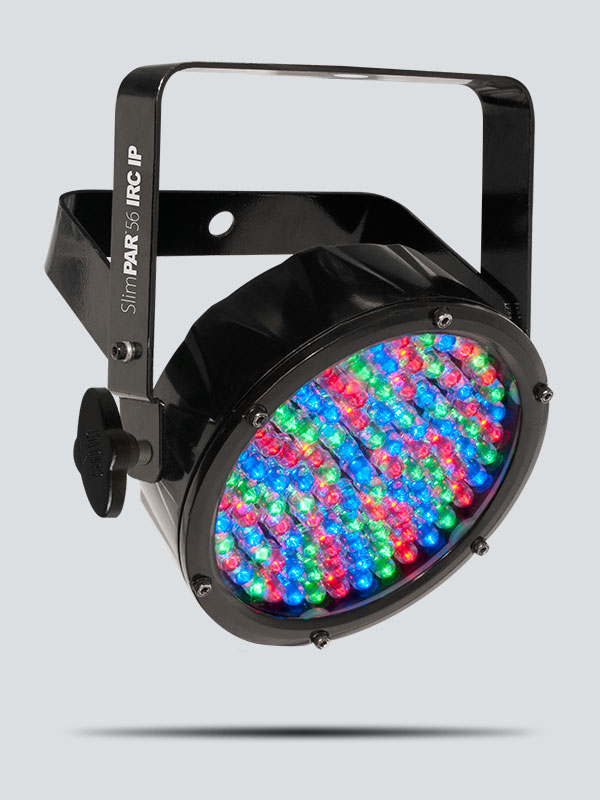 CHAUVET-DJ Slim PAR 56 IRC IP - светодиодный прожектор. Данная модель оснащена 108 светодиодами RGB мощностью 0,25 Вт, угол раскрытия луча составляет 14 градусов, угол засветки 23 градуса, а освещенность составляет 876 lux на 2 метра. Также данный светодиодный прожектор оснащен 2 режимами DMX каналов, автоматическим режимом работы, звуковой активацией, а также режимом Master/Slave.