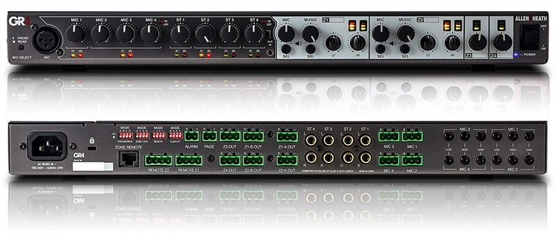 ALLEN HEATH GR4 - Аналоговый зонный микшер 1U, 4 микр. входа, 4 стерео входа, 4 зонных выхода. 4 микрофонных входа.. 4 входа стерео.. Стереофонические балансные выходы на две зоны.. Моновыходы Z3, Z4.. На лицевую панель вынесен миниджек под портативные источники звука.. Занимает одни юнит в рэке.. Поддерживается отдельное управление миксом в зонах 1 и 2, назначение сигналов со входов в зоны.. На фронтальной панели находится микрофонный XLR вход под анонсы и пейджинг.. Микрофонные входы: эквалайзер на 2 полосы, регулировка гейна, автоматический дакинг (параметры настраиваются).. В выходах Z1 и Z2 есть дополнительный эквалайзер на 2 полосы.. Диапазон рабочих напряжений 100-240 В. Универсальный источник питания.. Поддерживается интеграция с системами пожарной безопасности/пейджинговыми станциями.. Можно подключить 1-2 опциональные настенные панели удаленного управления - модель PL-14 или подобные контроллеры.