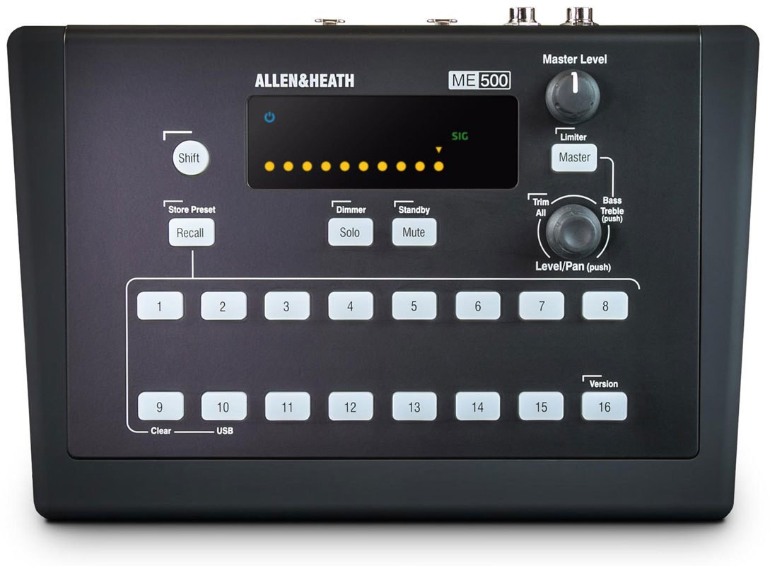 ALLEN HEATH ME-500 Микшер персонального мониторинга 16 моно/стерео каналов, блок питания ALLEN HEATH/p Allen Heath выпустил новый 16-канальный персональный микшер ME-500, который пополнил линейку устройств цифровой системы персонального мониторинга ME. Новинка представляет собой простое в использовании решение для организации персонального мониторинга в храмах, в прокате, в оркестрах. ME-500 позволяет музыкантам самостоятельно управлять своими мониторными миксами, включающими 16 стерео или моно источников. Новый микшер имеет такой же компактный размер, как и 40-канальный персональный микшер ME-1, но более прост в настройке и управлении. Система ME легко подключается к цифровым микшерным системам Allen Heath по принципу plug n play, а также может использоваться с цифровыми микшерами сторонних производителей при подключении через хаб ME-U. ME-500 имеет дисплей с возможностью регулировки яркости, 16 кнопок с подсветкой, кнопки Mute и Solo, регулировку уровня, лимитер и эквалайзер на выходе, плюс энкодер для нави