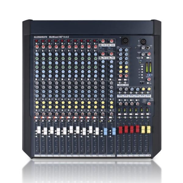 ALLEN HEATH WZ4 14 - Микшерный пульт 10 моно, 2 двойных стерео входа, 6 AUX шин MixWizard - микшерный пульт, давно зарекомендовавший себя отличным звуком и надежной конструкцией. 4-х полосный параметрический эквалайзер с двумя настраиваемыми средними полосами, фейдера 100 мм, 6 внешних посылов, 12-ти сегментные индикаторы уровня и трансформирующаяся конструкция для настольной или рэковой установки пульта. В новом поколении улучшен дизайн и функциональность: добавлены выключатель эквалайзера на каналах и двойной процессор эффектов, так же есть возможность установки многоканального USB интерфейса для записи и воспроизведения звука. Характеристики:. 19 рэковый формат. 12 mic/line каналов с балансным XLR/TRS подключением. 100mm фейдеры. 2 Dual Stereo входа с раздельными регуляторами gain. 4х полосные эквалайзеры с 2 настраиваемыми полосами. 6 Aux посылов. 4 подгруппы. 6x2 матрица. Генератор тона и розового шума. Трехцветная, 12-ти сегментная индикация. +48V Фантомное питание. XLR вход с регулятором trim для T