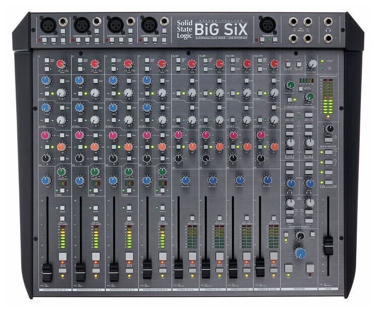 Solid State Logic Big SiX —12-канальная микшерная консоль, расширенная версия модели SSL SiX с интегрированным USB-аудиоинтерфейсом с 16 входными и выходными каналами.