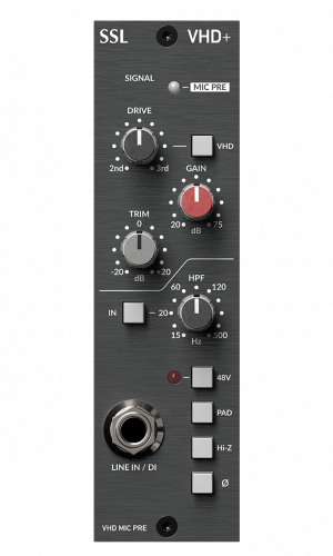 VHD + Pre - чрезвычайно универсальное устройство записи и обработки. Этот предусилитель может доставлять ультрачистые записи класса SuperAnalogue по стандарту SSL, но также имеет переключаемый режим VHD+. Запатентованная в SSL система Variable Harmonic Drive (VHD+) использует 100% аналоговый сигнал для генерации гармонических искажений.